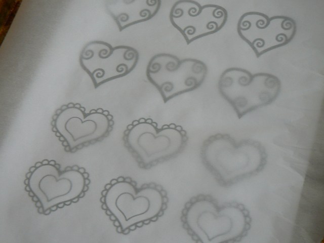 For the hearts and words I just melted white chocolate in the microwave and placed in into a disposable pastry bag with a small round tip. I am terrible at making hearts so I printed some from an image search to trace by placing it under a sheet of parchment paper. I tried to get fancy with the scrolls but kept messing them up (hence my need to practice) so I ended up using the main shape and just winged it with the text. White chocolate hardens very quickly so after about 5 minutes in the fridge they were ready to go.