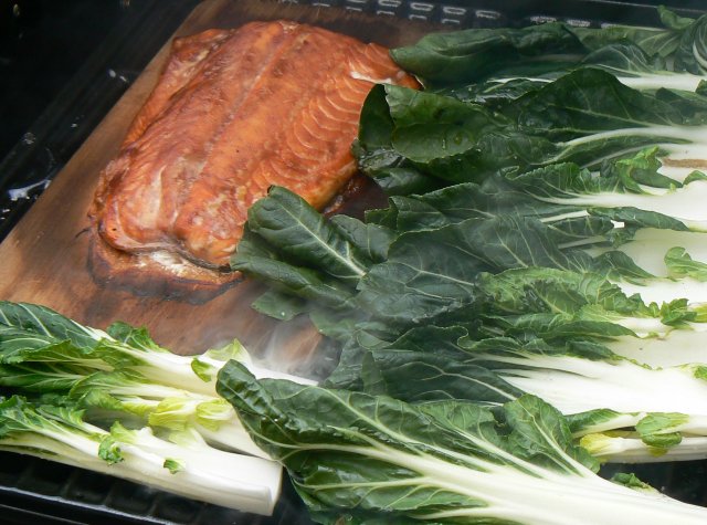 This really is one of the simplest recipes to prepare. You whisk everything together in a bowl and then let the salmon marinade in it for 30 minutes. Preheat your grill so it is nice and hot, place the fish on the plank and let it smoke with the lid down for approximately 10 minutes. Then brush more of the marinade on so you get a nice caramelized crust. Continue to smoke it with the lid down for 5-10 more minutes. To grill the bok choy brush it with olive oil, salt and pepper and let it cook about 10 minutes, flipping halfway through.