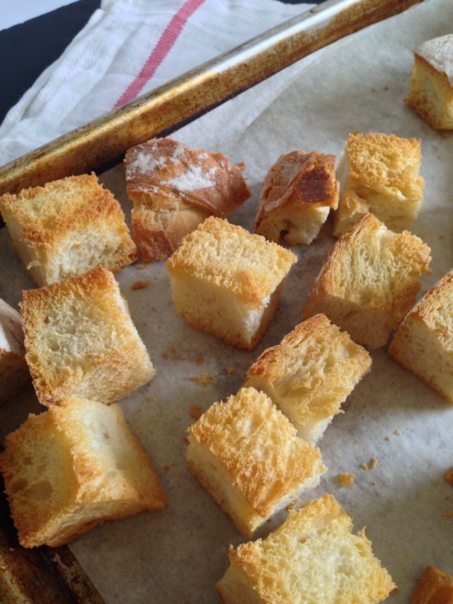 I chose a simple white loaf of bread that is not too chewy. Buy it whole so you can control the size of the bread cubes. Speaking of the bread cubes…aren’t they just so pretty all nice and toasted in garlicy heaven? Garlicy is definitely a word, right?
