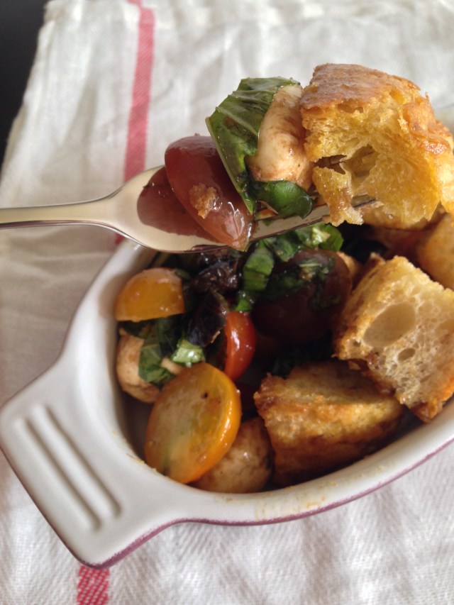 Panza-what? This Tuscan salad is a mouthful to pronounce. Traditionally, it contains oil, vinegar, onions and other vegetables with the bread soaked in the liquid. My favorite way to prepare it keeps the bread slightly crunchy still and makes the most of those last few summer-kissed tomatoes.