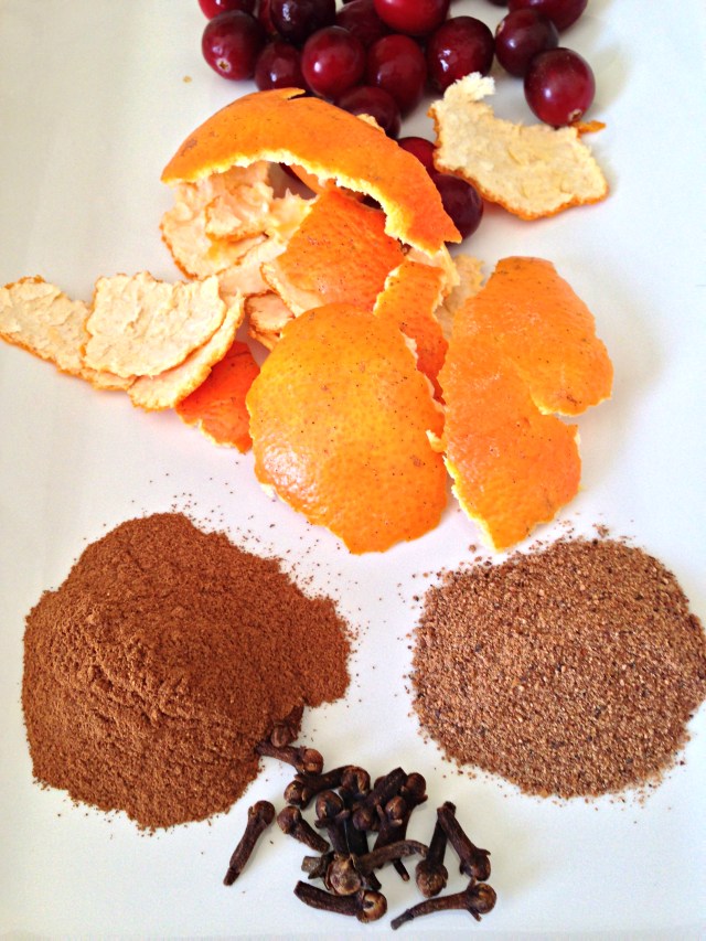 You can use everything in this recipe to simmer away on the stove and make your house smell amazing. I had some leftover peels (we have been snacking on tangerines for days now and I put the peels in the freezer to keep just for this), a handful of cranberries that ended up on the floor and some cinnamon, clove and nutmeg. Put it in a big pot full of water and let it simmer all day. Just add more water as it evaporates. You could also use your slow cooker for this as well. Happy Thanksgiving!