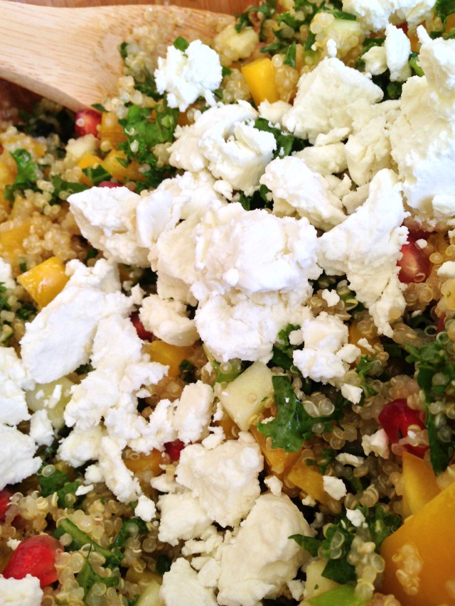 7. Once the quinoa is room temperature add it to the large bowl and mix in the dried cranberries, pomegranate seeds and dressing.