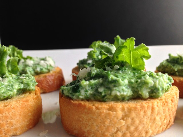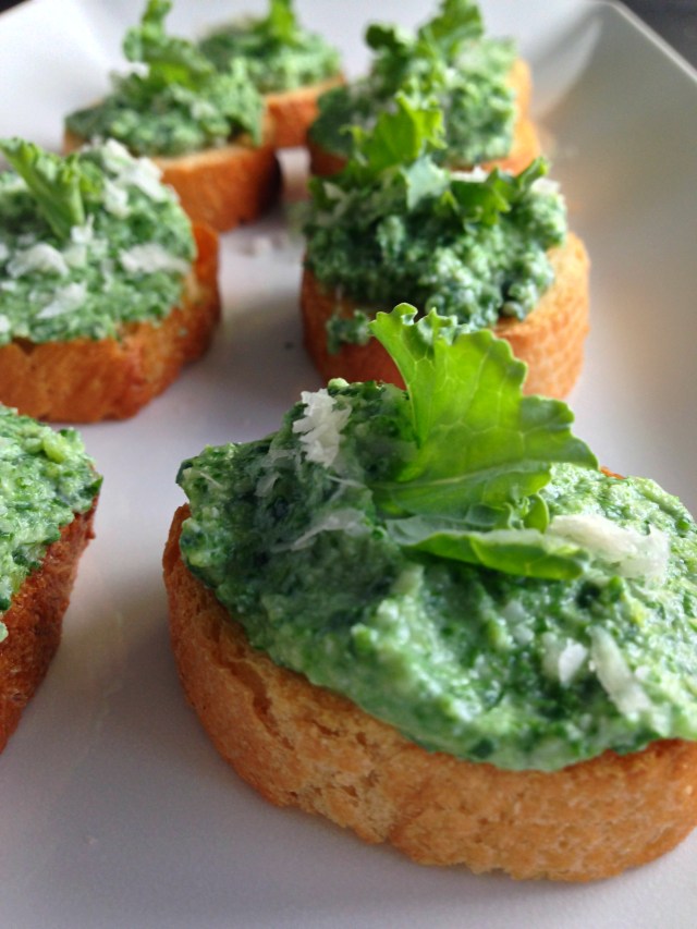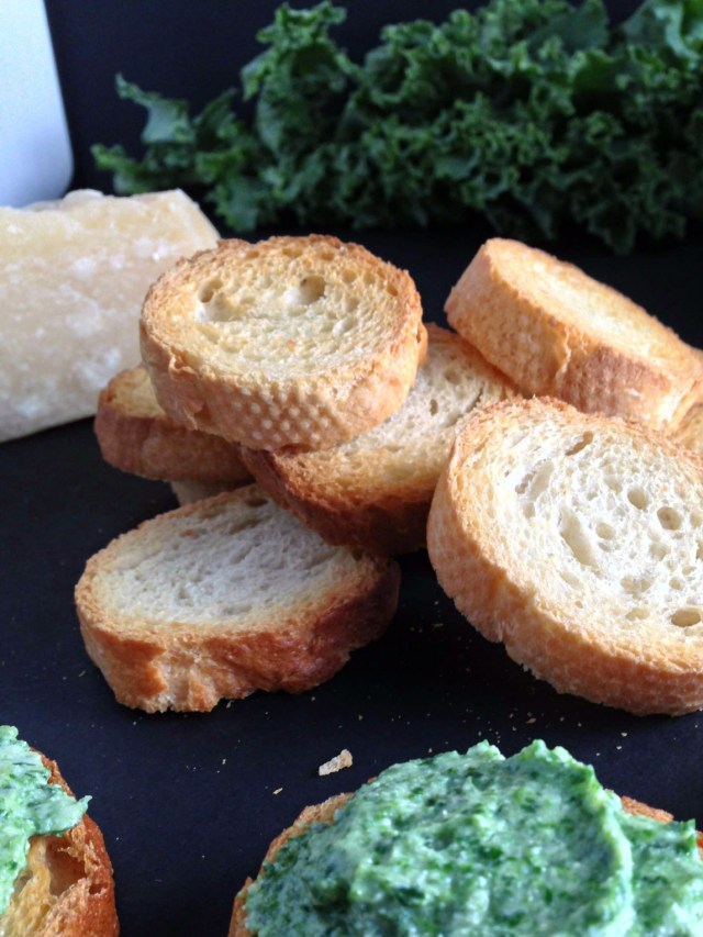 - Spread 1 tablespoon on each baguette slice and top with a little cheese and bite size piece of kale.