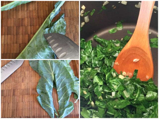 - Rinse and dry collard greens. Remove the stems and roughly chop. Set aside.