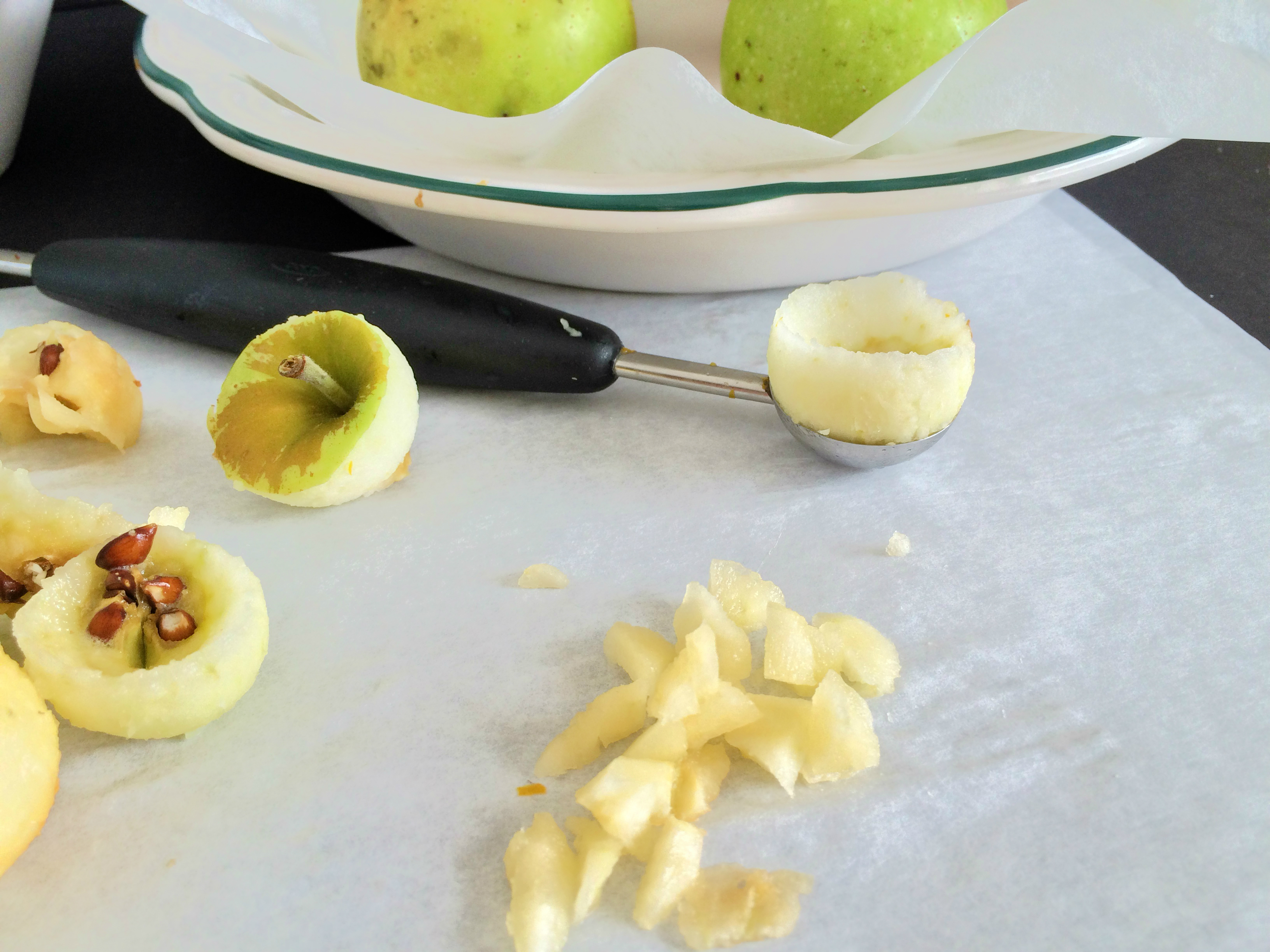 2. Core apples using an apple corer or melon scooper, leaving the bottom intact. Place in baking dish or pie plate lined with parchment paper.