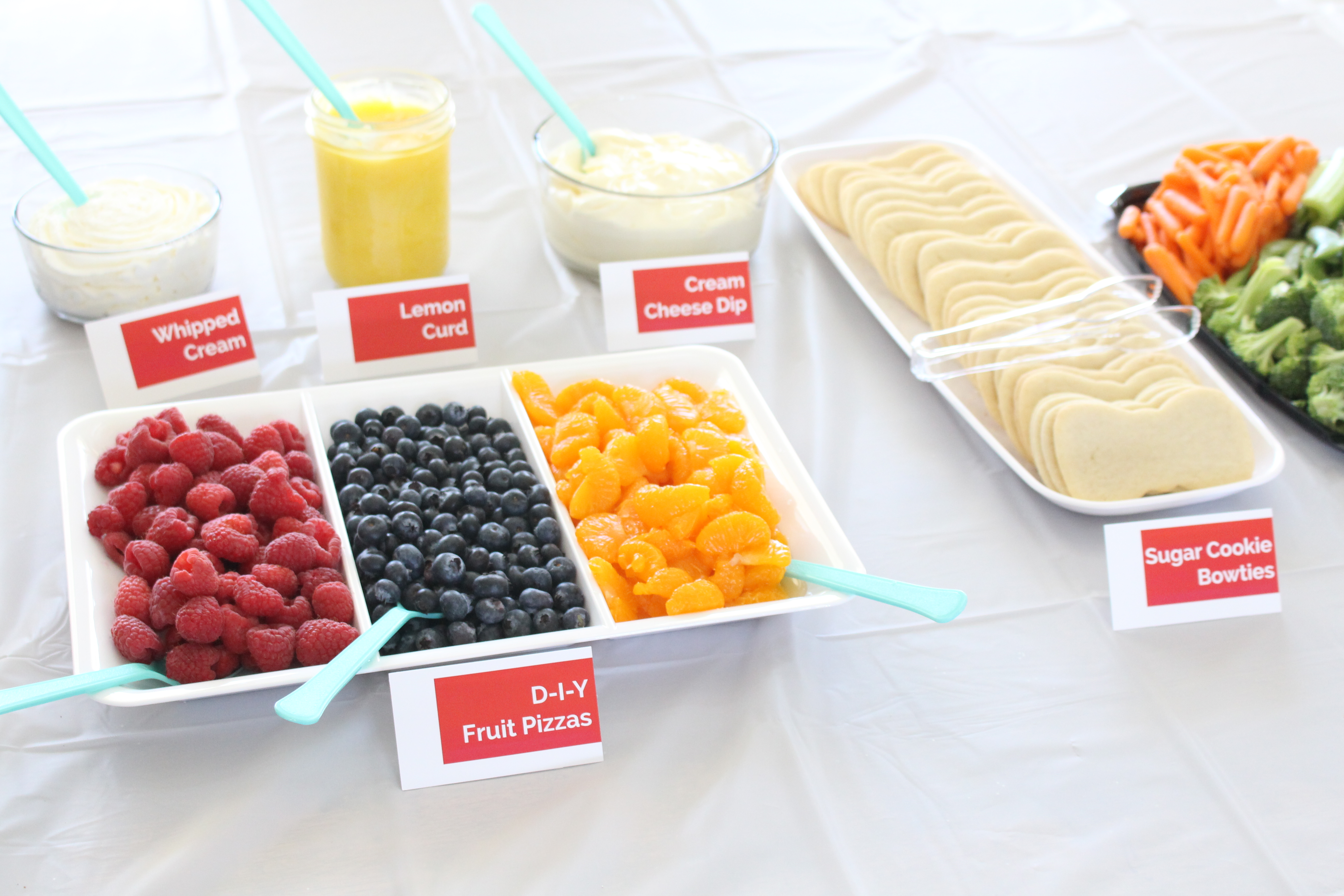 I was careful to make ahead and freeze as much as I could to save me time and energy the days leading up to the shower. One of my favorite things we had was the DIY sugar cookie fruit pizzas. I made the cookies two weeks ahead of time and froze them so all I had to do the day before the shower was pop them in the fridge. Lemon curd, cream cheese fruit dip, fresh whipped cream, raspberries, blueberries and mandarin oranges were set out to top the cookies. The cheesecake froze beautifully and I placed it in the fridge to thaw the evening before and piped it with fresh whipped cream. I waited until just before people arrived to decorate it with sprinkles so the colors wouldn’t bleed.