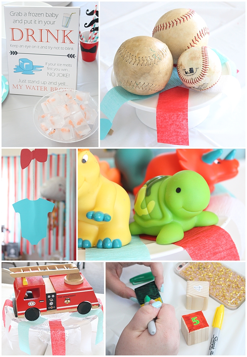 I wanted to keep the decorations simple and inexpensive so I used the many cake platters I own and decorated them with streamers and toys. A few of the toys (like the softballs and baseballs) I got second-hand from a consignment store and the others I borrowed from the children’s center I volunteer at. I got onesie and bow tie cutouts and made banners and streamers using them. We also made a photo booth backdrop using streamers and painting tape. People are more inclined to let you photograph them at events if they can hide behind a silly prop! It also made for great pictures when she sat in front of it while opening presents. One of my favorite decorations ended up being the eating utensils. We used washi tape and napkins to make bow ties and they turned out so adorable.