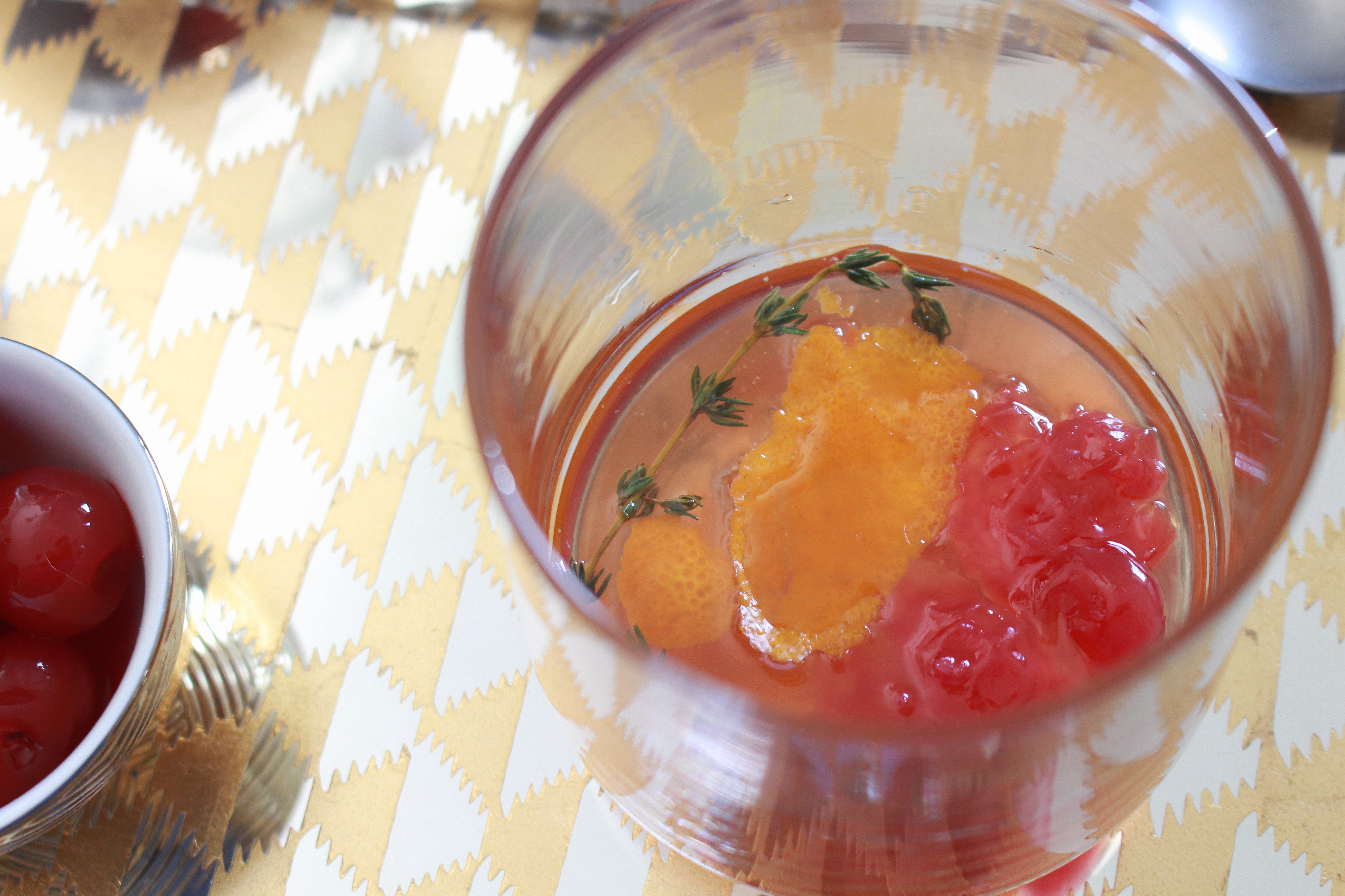 1. Place orange peel, thyme, cherries, bitters and maple simple syrup in the bottom of a short rocks glass.
