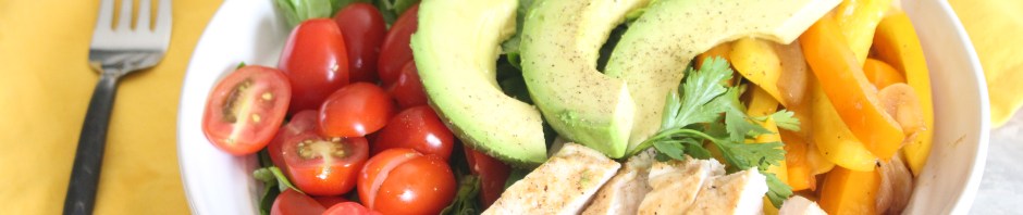 One evening, after a long day of errands and work I looked in the fridge and realized all I had was chicken, peppers and a door full condiments. Dinner needed to magically appear out of that and the sad little bowl on the counter, which usually contains onions, garlic and some other random produce. I could not be bothered to run to the store so for dinner that evening we ate chicken rubbed with taco seasoning and fajita-style peppers and onions. I told my husband it was Paleo-style fajitas so it seemed like I put forth some effort and he just laughed, knowing I was trying to cover up my ill attempt at dinner. We got a good laugh out of it (that was not my first attempt to pull one over on him)! It was a sad little meal but it was delicious and so I decided to turn it into a salad with a yummy cilantro-lime vinaigrette.
