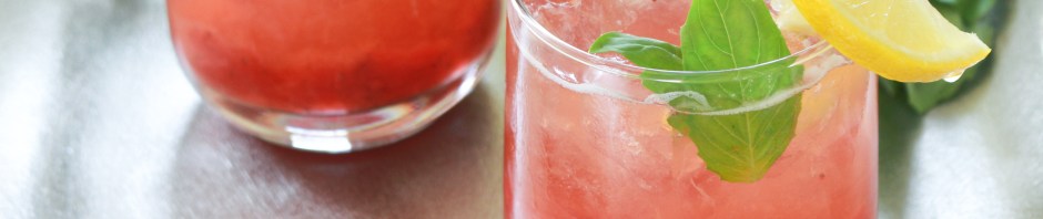 5. I like to place the strawberry sauce in a glass, followed by ice, the lemonade and garnish it with lemon twists and basil leaves.