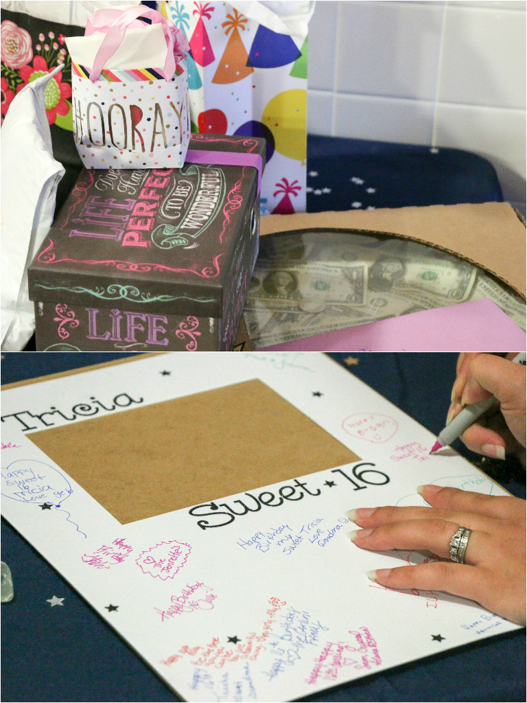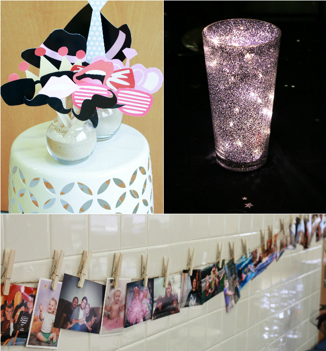 Our party planning committee consisted of a handful of crafty people who put lots of love into fun details. We made a photo booth backdrop (complete with silly props), handmade signs and banners and her mom spent a painstaking amount of time choosing photos of Tricia and pinning them above the cake and present table. Handmade centerpieces and an autograph photo mat were the perfect thing for her to remember the party by.