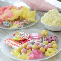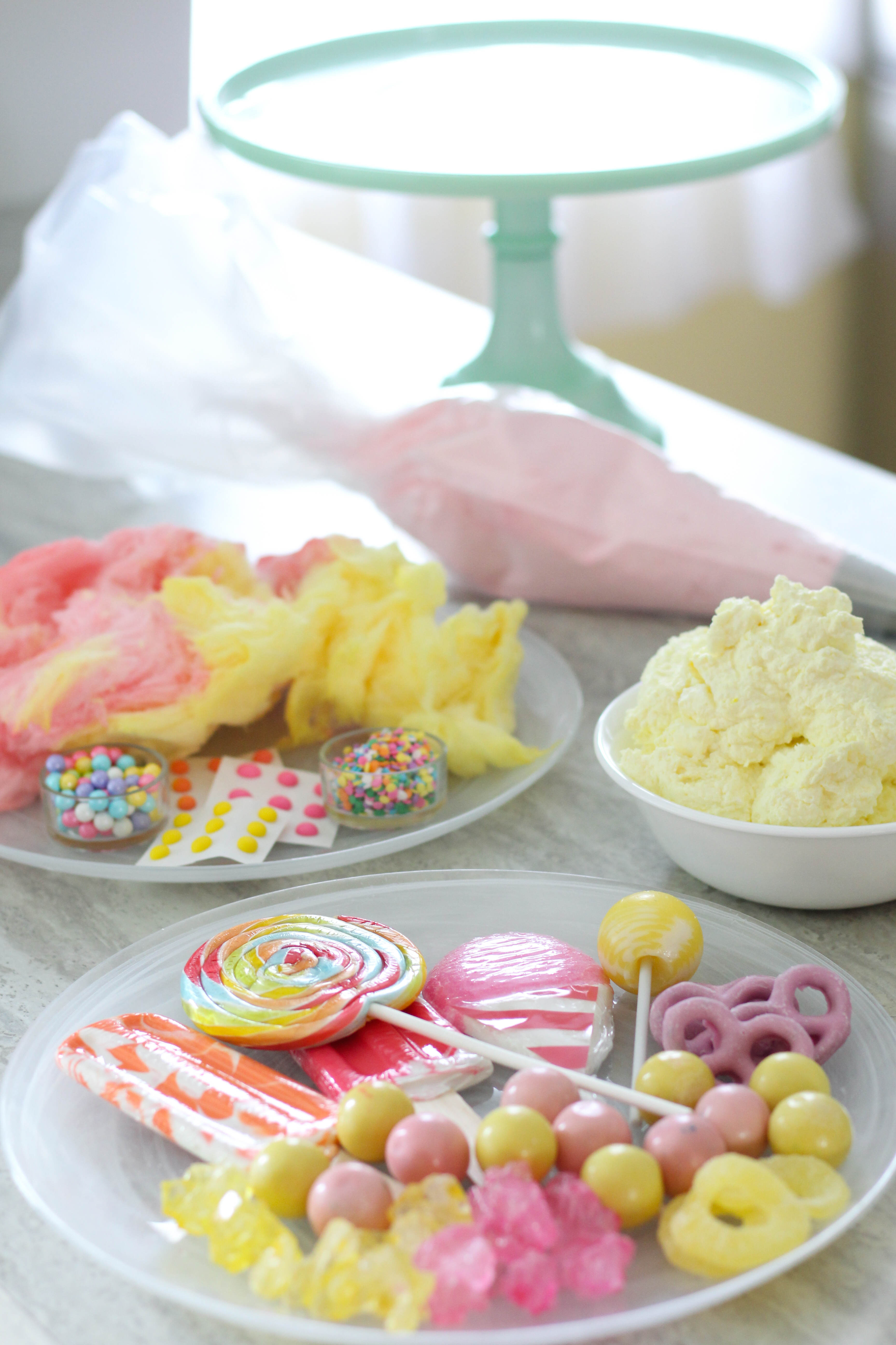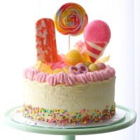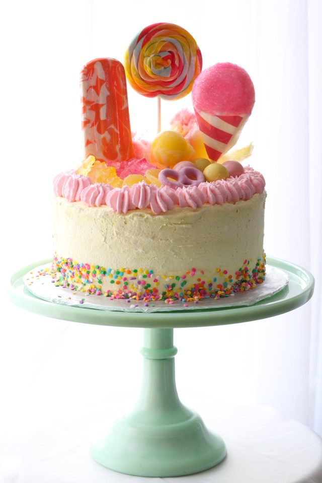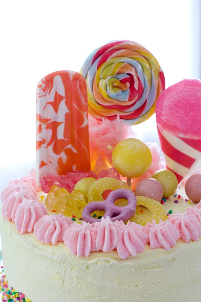 Notes: You will need three 8 inch cake pans of identical style and piping tips to do the border, if desired. For the candy, I recommend shopping the bulk bins, that way you can grab exactly the colors and types of candy you want without paying for bags of them.