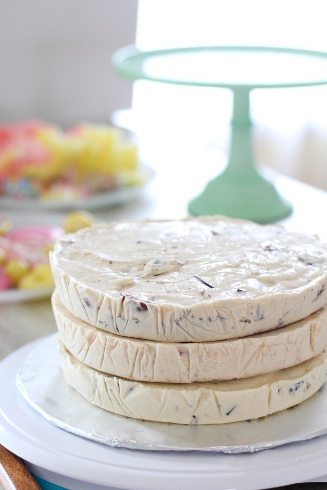 4. To assemble, place a layers together on a cake stand or plate. Do not spread whipped cream frosting in between layers – just stack them right on top of each other.