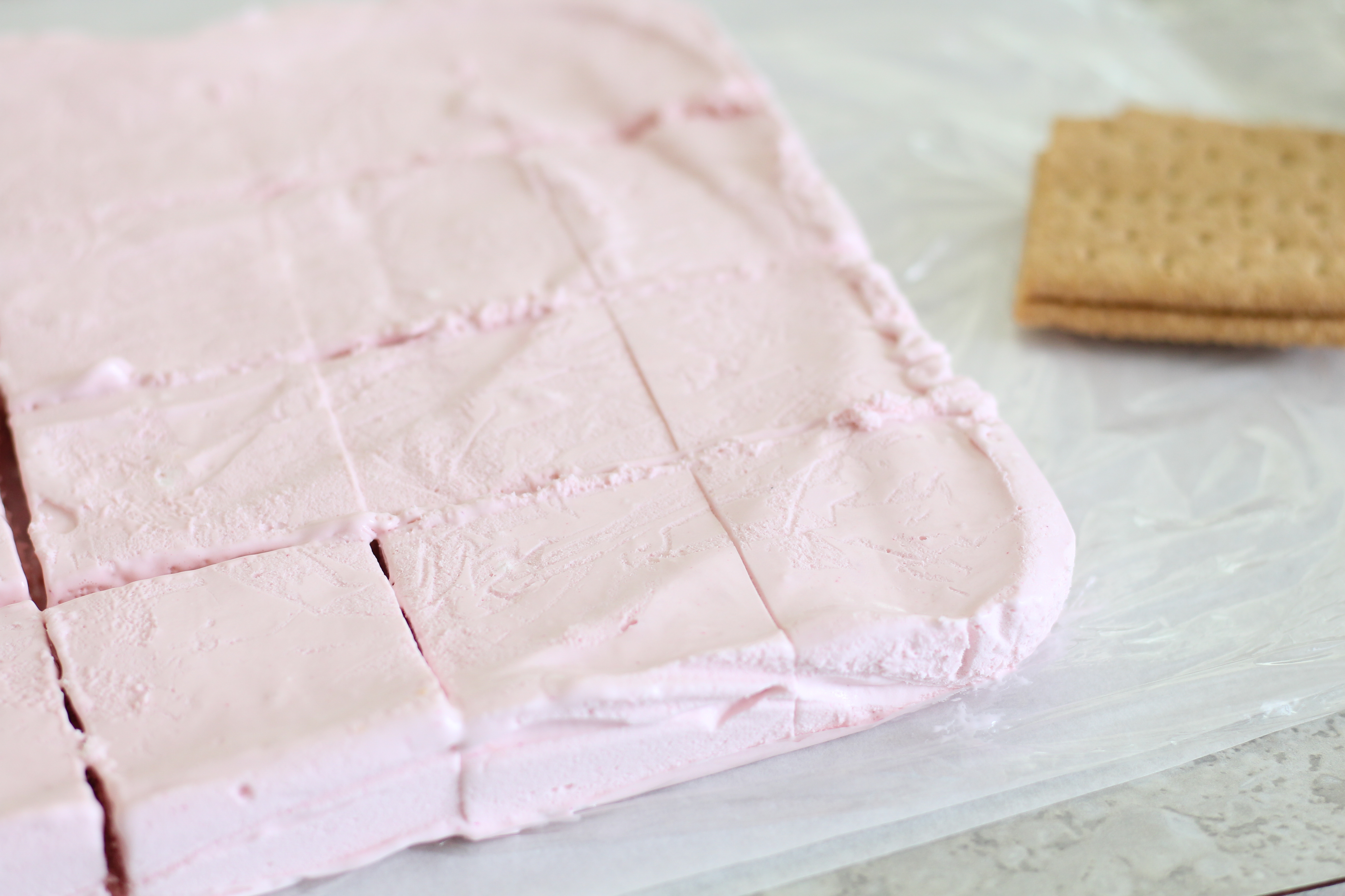 5. Working quickly, remove pink lemonade filling from freezer and turn out onto another sheet of plastic wrap. Cut into 12 squares. I found that removing each square using a small spatula and turning it onto a graham cracker worked best for me. Top each to make a sandwich and place on a parchment lined baking sheet and immediately return to the freezer for at least 30 minutes.