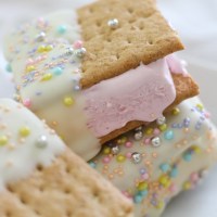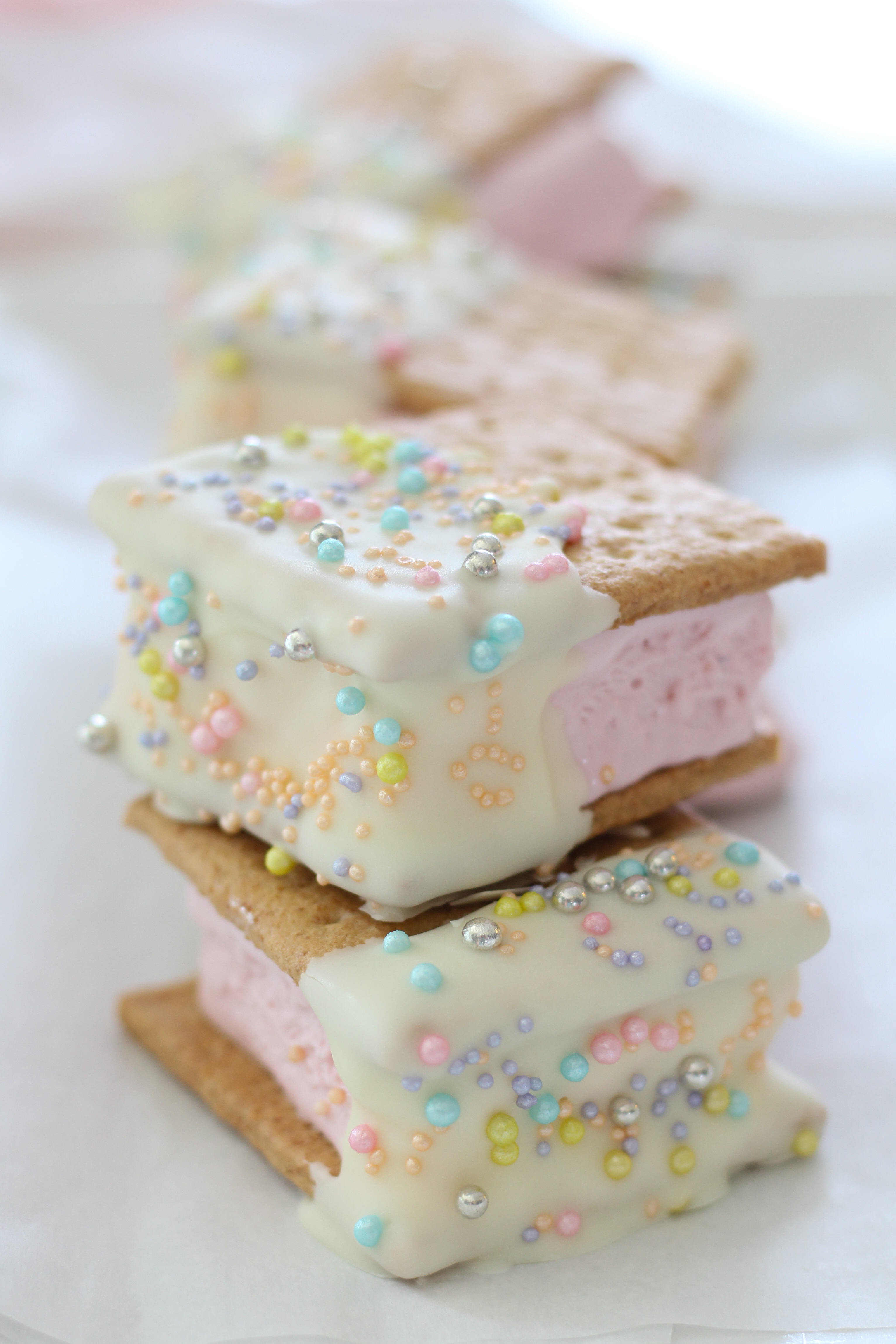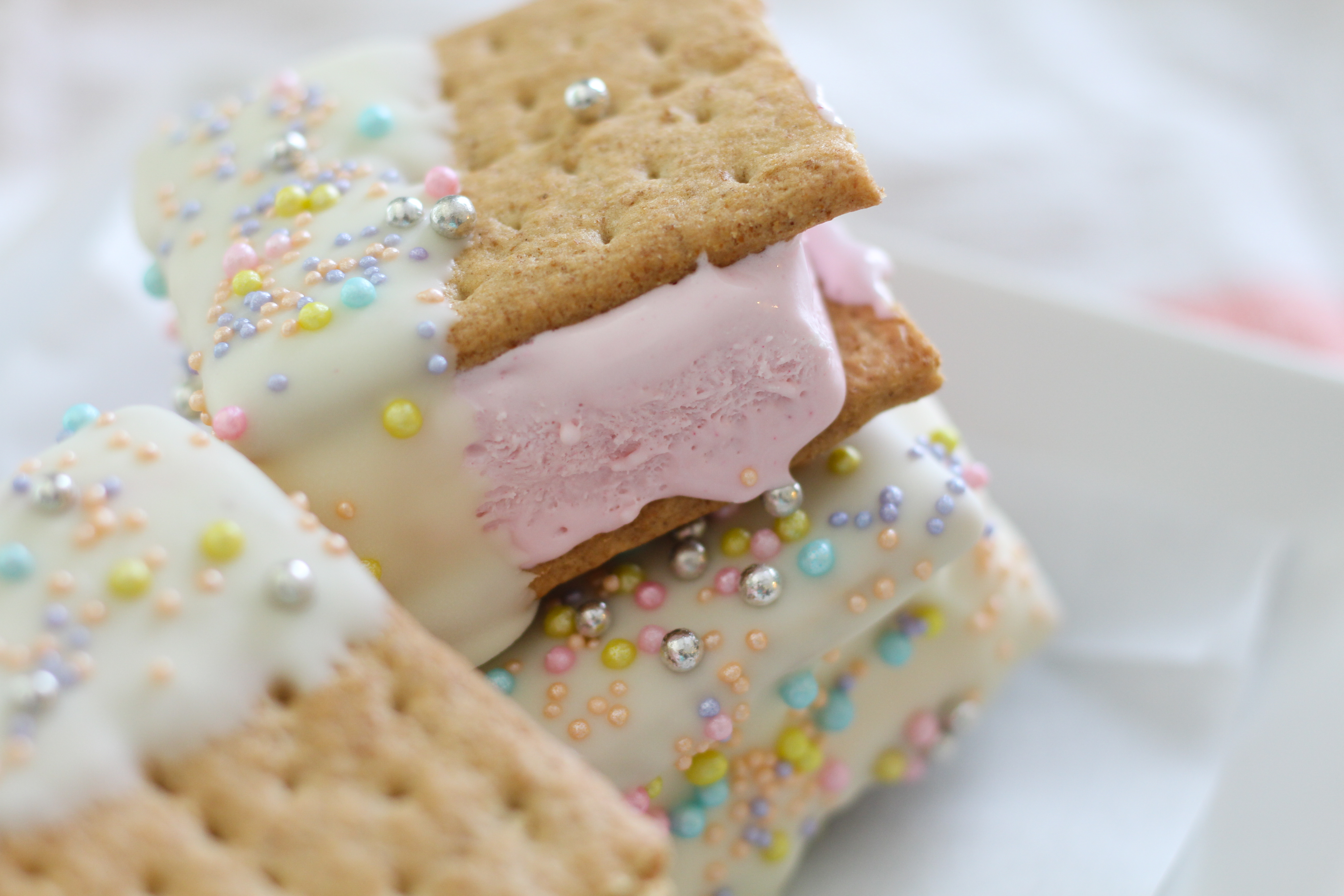 7. Melt wafers according to package directions. Remove half of the sandwiches from the freezer and dip one end about a third of the way in, covering each side. Immediately add sprinkles and place back on the sheet to return to freezer. Repeat with the second half.