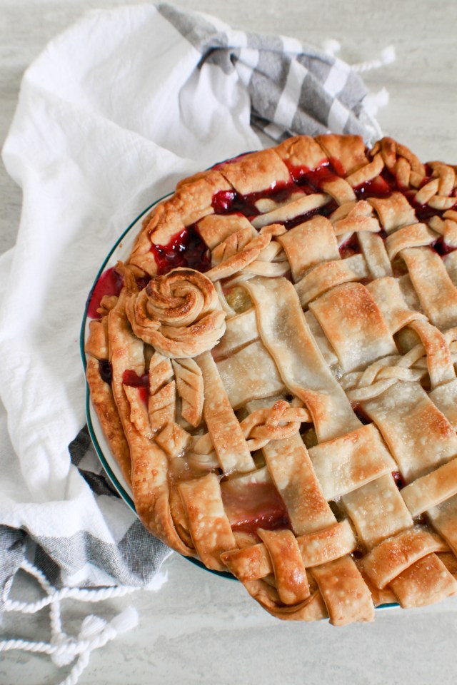 I had a lot of fun playing around with this pie crust design. I did a combination or lattice, braiding and my rose pie crust and I think it turned out quite lovely. Of course doing a standard top crust with a few slits or cut-outs would be perfectly lovely too. If you have time to play though you should go for it!