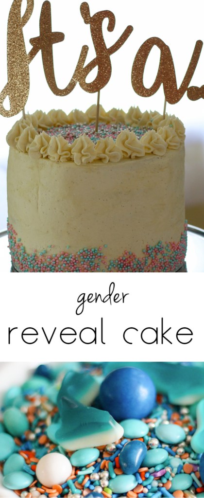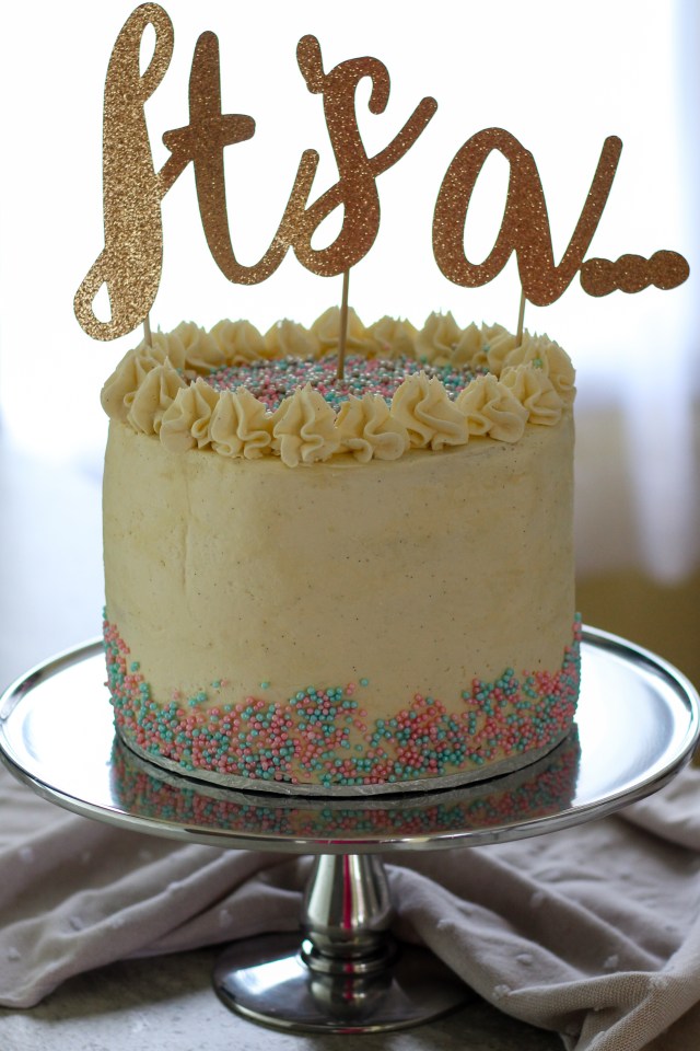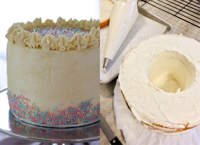 5. Frost the cake in a thick layer of frosting and smooth the sides. Using a Wilton 1M tip and disposable piping bag, pipe dollops of frosting around the edge. Set cake on a small, but stable container on a sheet pan. A heavy, flat top canister works perfectly for this or even a coffee canister. Carefully apply the sprinkles in a sweeping motion from the bottom, working up. I like to leave a rough edge, so don’t be too concerned about making a perfect line of sprinkles across the bottom. Throw some sprinkles on the top and keep refrigerated until the big reveal. Allow to set at room temperature at least 1 hour before serving so the frosting has a change to soften.