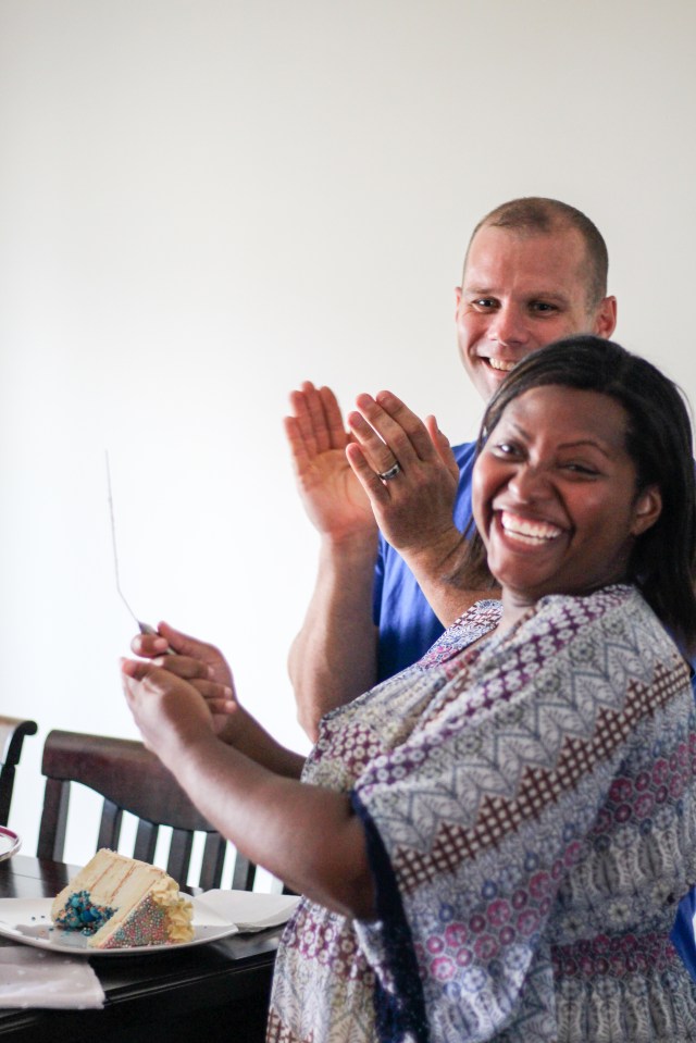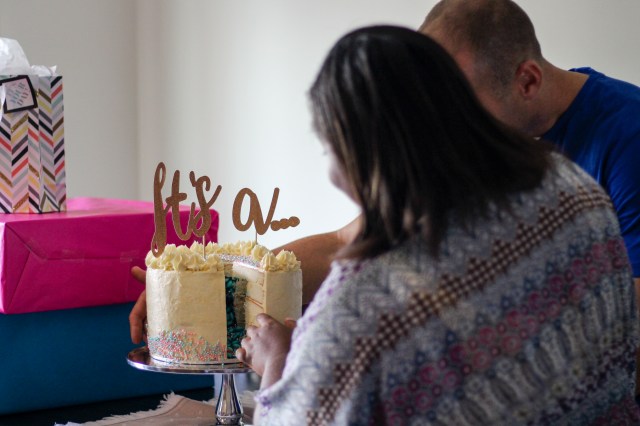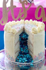 6. A note on cutting: I attended this gender reveal so I was able to pre-cut the cake slice for the parents. I did this in case any of the candy bled and I did not want them to see any stray color when cutting the cake themselves. Alternately, you can pre-cut the revealing slice before frosting the cake and use a couple toothpicks to indicate where the cuts are. Make sure you do a large slice (mine was probably 4 inches wide) so the candy spills out easily.