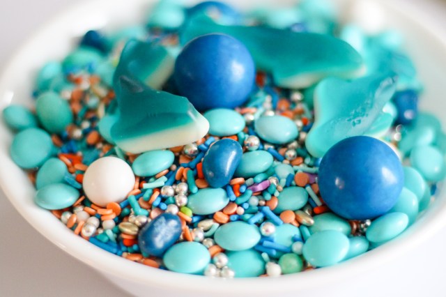 3. Carefully pour your candy/sprinkles combination into the hole. If using large gummies (like the gummy sharks I used) place them in between the candy layers. If any candy goes astray, scoot it back into the hole.