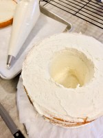 2. Place the cake drum on a wet paper towel on top of your turntable (this prevents it from slipping). Spread a small dollop of buttercream on it before placing down a solid cake layer. Spread a thin layer of frosting over it and place a holed-out layer on top. Repeat this process with each of the holed-out layers. Once all your holed-out layers are stacked, apply buttercream on the inside along all of the sides and on the top of the tallest layer.