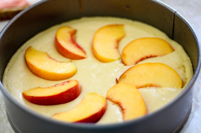 5. Carefully remove the cake from the oven and gently place the peach slices on the surface of the cake.