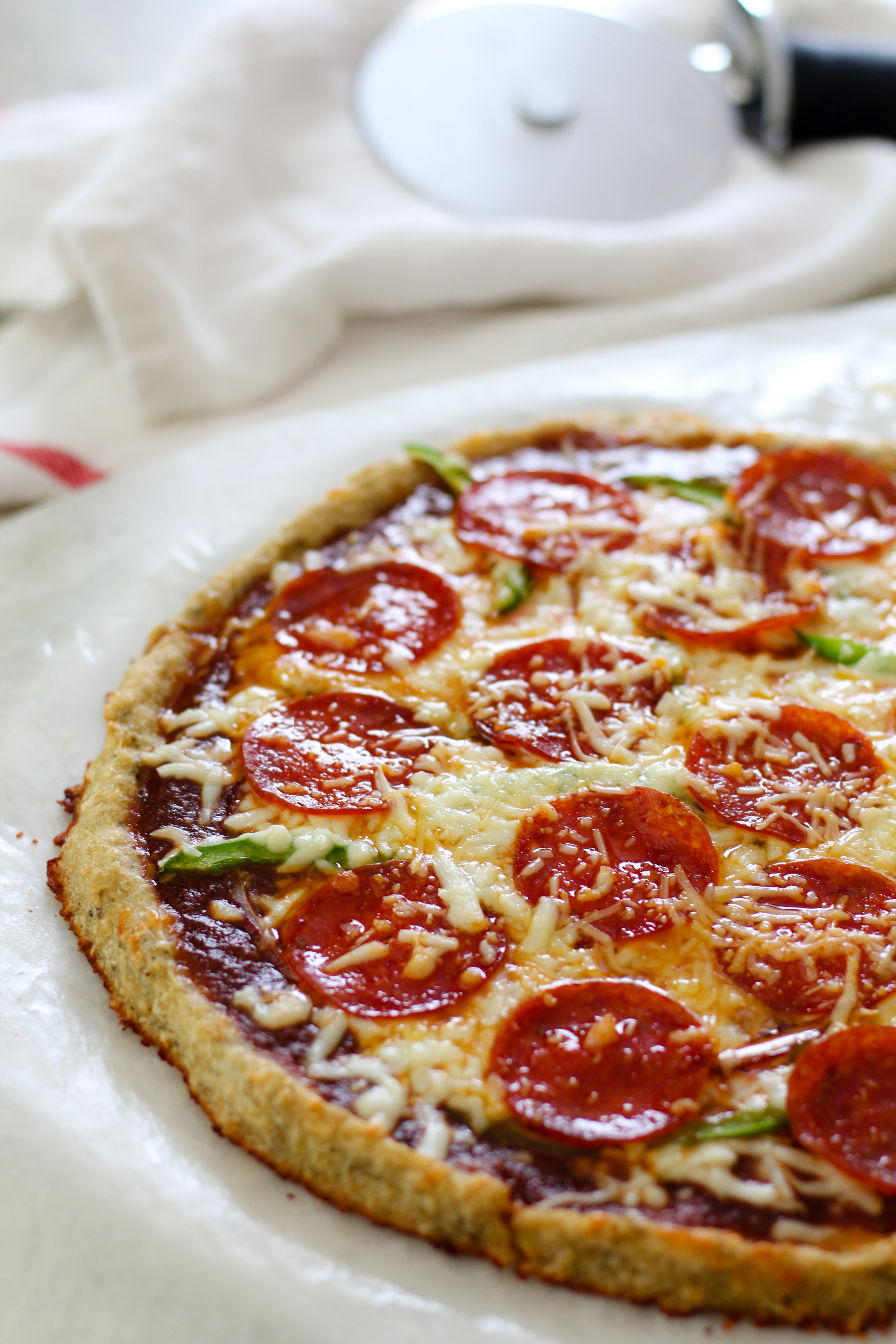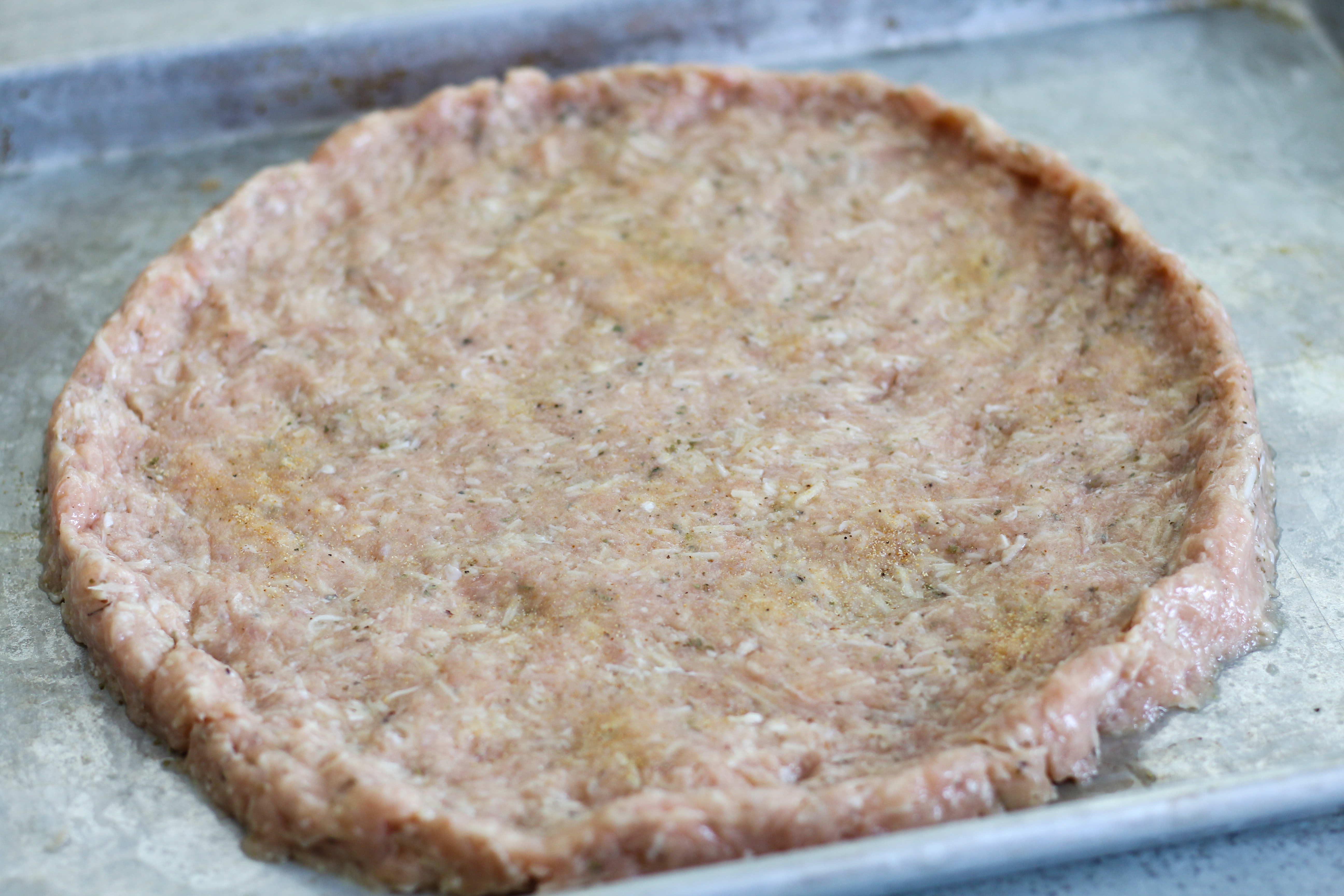 An important note about this crust: because there is so much cheese in this it is extremely sticky. It is important to spray your sheet pan or pizza pan well, even if it is non-stick. Avoid a pizza stone and definitely use non-stick if you have it. I forgot to when I did the photos for this and it was quite the task to move it!
